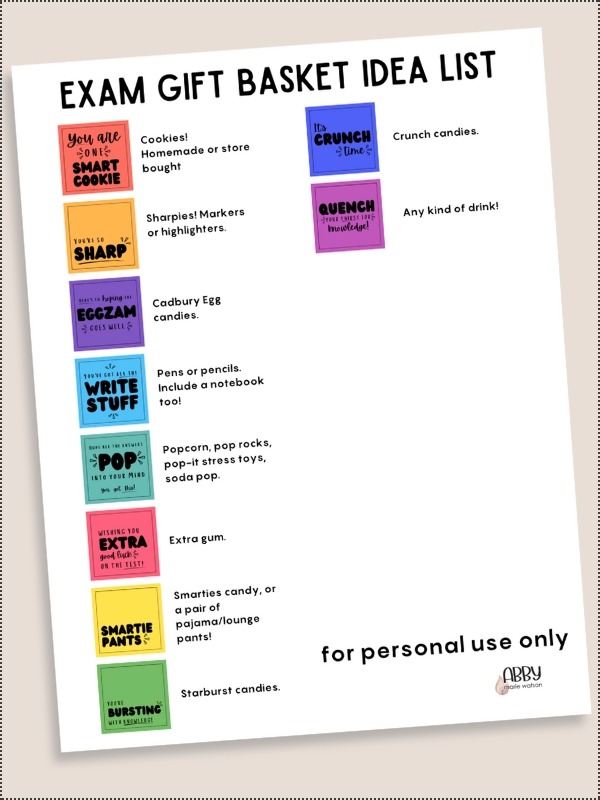 I’m also including a list of ideas for items you could use with each tag in your Exam gift basket. This list is NOT exhaustive, so feel free to come up with your own ideas!