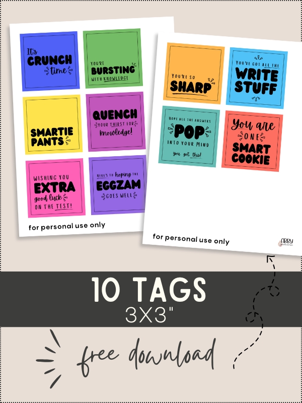 Click the Download button below to download your free Exam gift basket tags! Once downloaded, I recommend printing on cardstock. Then cut each tag to size and attach to your Exam gift basket items! Spread some good, my friends!