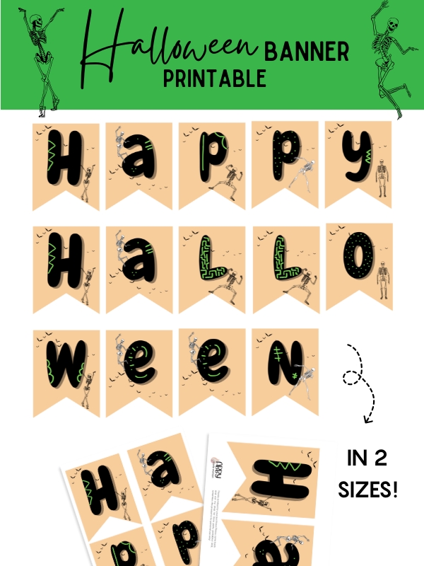 This is probably the simplest of 3 banner designs, but it’s also my favorite! Something about those fun dancing skeletons on each banner piece just gets me! I incorporated bright green into this color scheme because Halloween doesn’t have to stick to just black and orange!