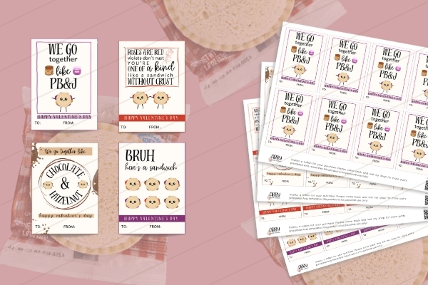 This is one of my favorite food-themed class Valentine’s Day card sets. These cards are meant to be paired with any kind of crustless sandwich (think: Uncrustables or other brands). This is perfect for a preschool class if you don’t want to overload on candy!