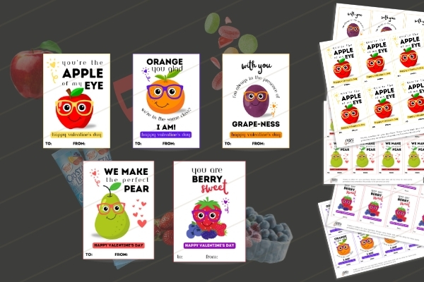 These fruit-themed Valentines are so versatile! Add real fruit, fruit juices, fruit candies, fruit snacks, fruit roll-ups, fruit chews, etc! Maybe it’s because I wear glasses, but these glasses wearing fruit faces have a special place in my heart!