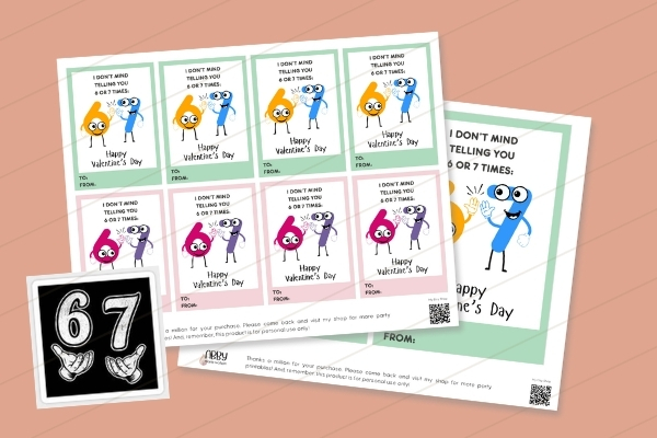 This is what I’m using for my kids class Valentine’s Day cards this year. You can’t even count to ten around our house without someone (including my 4 year old!) shouting out “siiixxx-seeeevveeen.” I plan to pair with these fun 6/7 stickers!