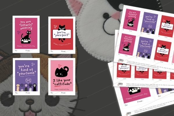 My daughter LOVES kitties, so I made these for her to use on Valentine’s Day. The color combinations are vibrant and the kitty-puns will make everyone smile. I’m pairing these with a cute kitty key chain and cat stickers for my daughters preschool class!